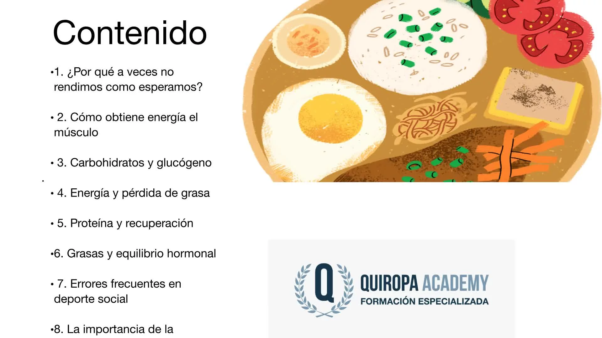 "La nutrición es el combustible de tu recuperación. En esta formación de Quiropa Academy, analizamos los pilares de una alimentación funcional diseñada para reducir la inflamación sistémica, mejorar la reparación de tejidos y potenciar tu energía diaria desde un enfoque clínico y equilibrado."